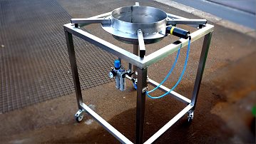 Der Arbeitstisch dient der Ablage von granulatbefüllten Säcken, die durch ein Sieb in Ihrer Korngröße definiert in einen anderen Behälter gefüllt werden. Gleichzeitig wurde die Kesselschütte mit einer Absaugvorrichtung ausgestattet. Eigene Blechbearbeitung und Schweisskonstruktion.